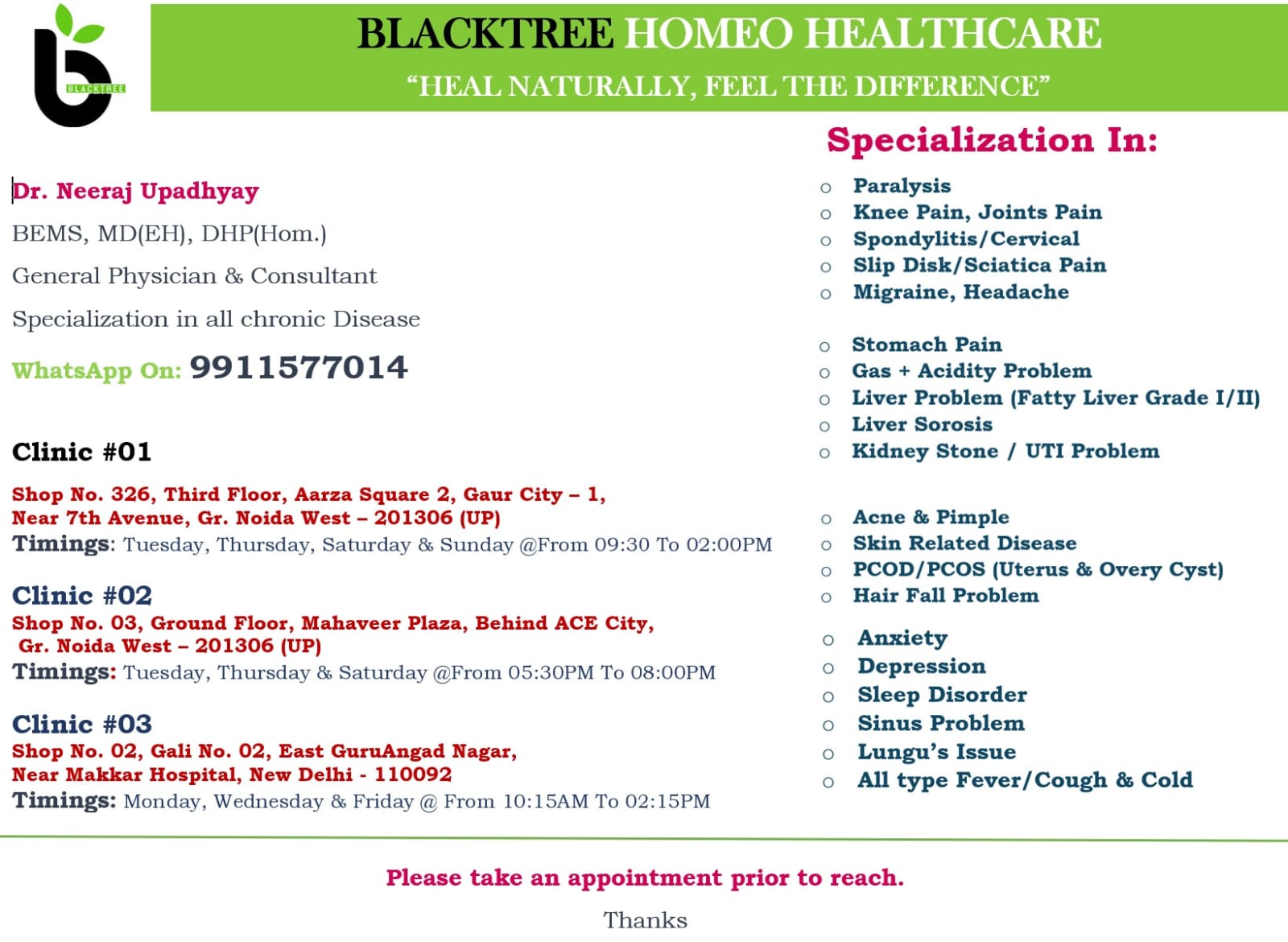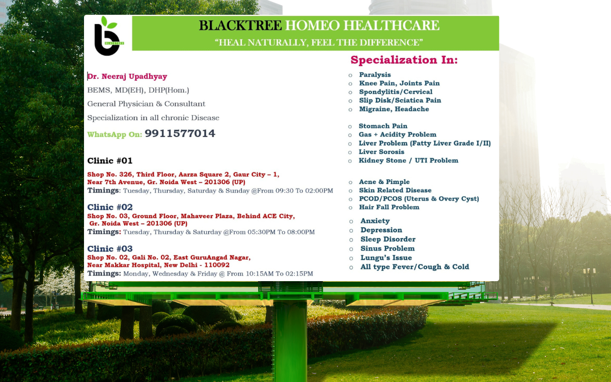 πΏ Blacktree Homeo Healthcare β Heal naturally with expert homeopathic treatments by Dr. Neeraj Upadhyay for chronic diseases. π₯ Clinics in Noida & Delhi, specializing in pain relief, skin issues, digestive disorders, and mental well-being. π² Book an appointment now!
