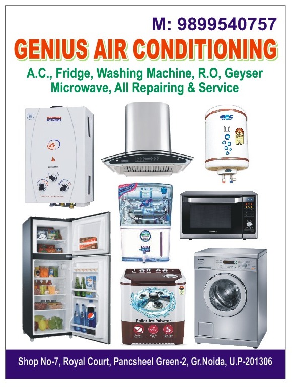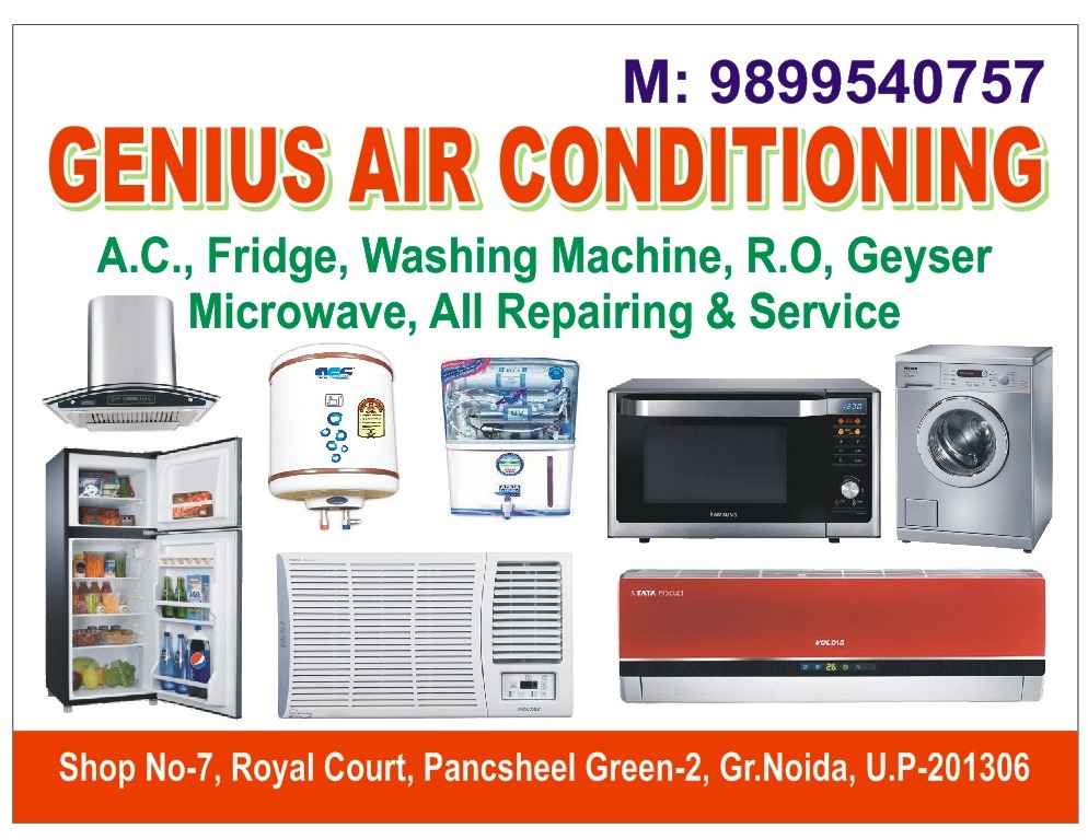 π§ Genius Air Conditioning - Your One-Stop Solution for All Appliance Repairs! βοΈπ οΈ We specialize in fixing and servicing: π¬οΈ A.C. | βοΈ Fridges | π§Ί Washing Machines | π² Microwaves π° RO Purifiers | π₯ Geysers | πͺοΈ Chimneys π Located at Shop No-7, Royal Court, Panchsheel Green-2, Greater Noida. π Call us: 9899540757 π‘ Quick. Reliable. Affordable! π