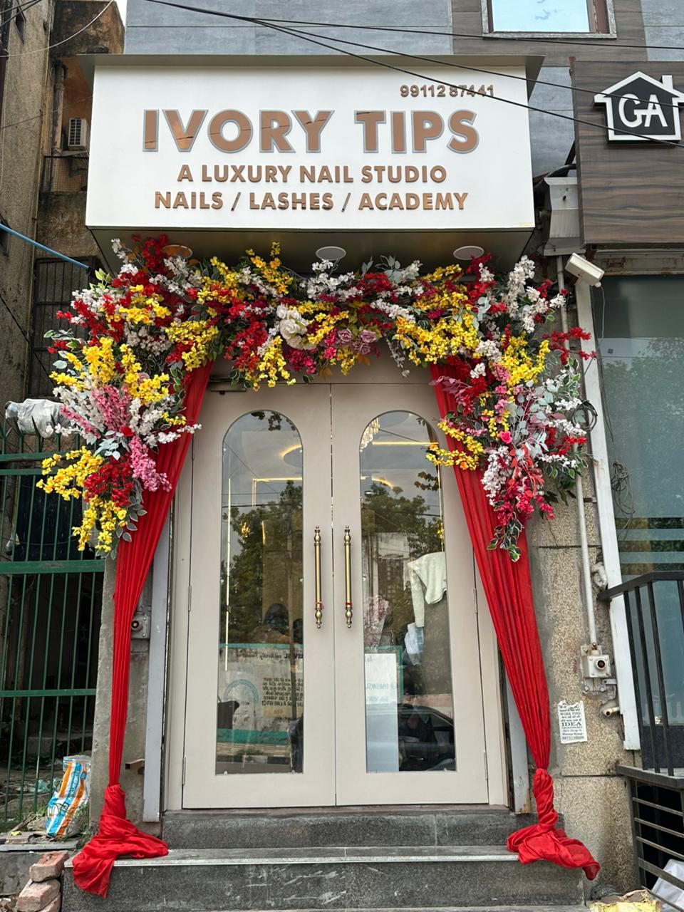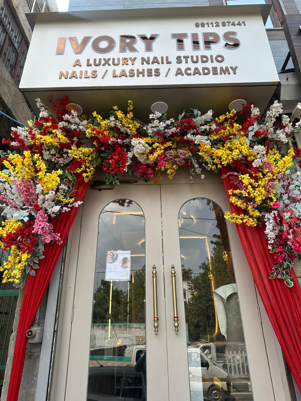 The entrance is beautifully framed by a lush, vibrant floral archway featuring bright red, yellow, and white flowers πΈπΌπΊ, set against dramatic red velvet drapes. This extravagant decoration suggests a recent grand opening or special celebration!
