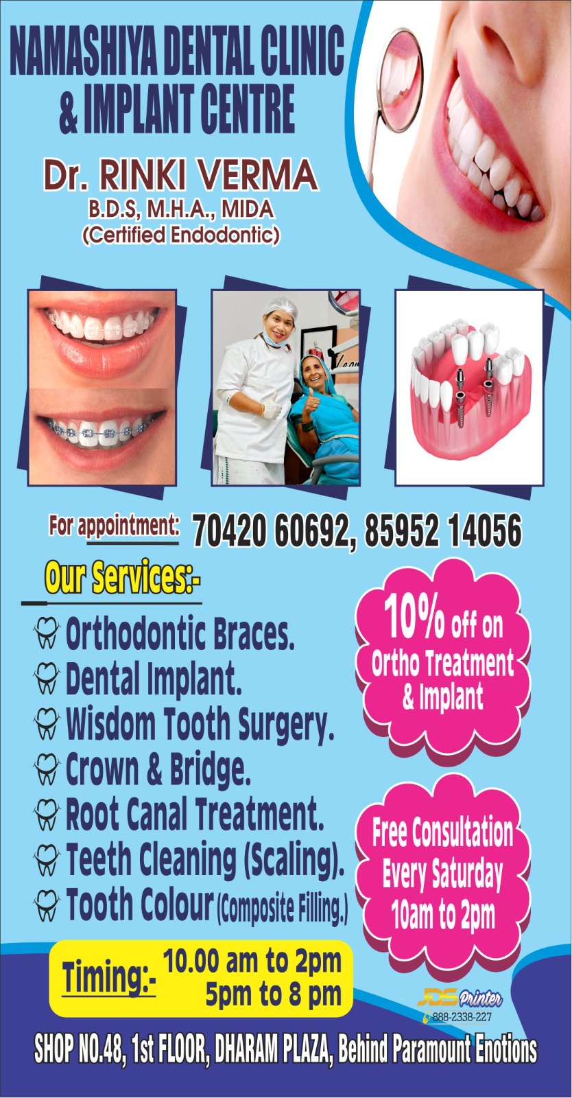Namashiya Dental Clinic & Implant Centre π¦·β¨ Led by Dr. Rinki Verma (B.D.S, MIDA, MHA, Certified Endodontist), we offer expert dental care with a gentle touch! From root canals πͺ₯ to dental implants π§© and smile makeovers π β weβre here to keep your smile healthy and bright! π Shop No.48, 1st Floor, Dharam Plaza, Behind Paramount Emotions, Sec-1, Greater Noida West