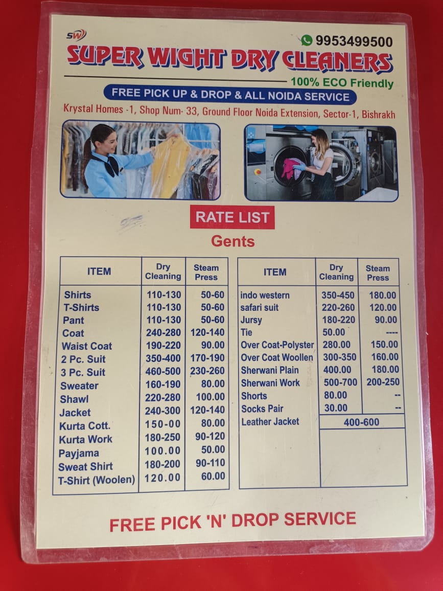 Super Wight Dry Cleaners π§Όπ in Noida Extension offers eco-friendly πΏ dry cleaning and steam pressing services for all types of garments, including sarees, π lehengas, sherwanis, and leather jackets. They specialize in cleaning upholstery, ποΈ sofa sets, car seat covers, curtains, and quilts. With free pickup and drop-off π across Noida, they ensure convenience and top-notch care for your fabrics.